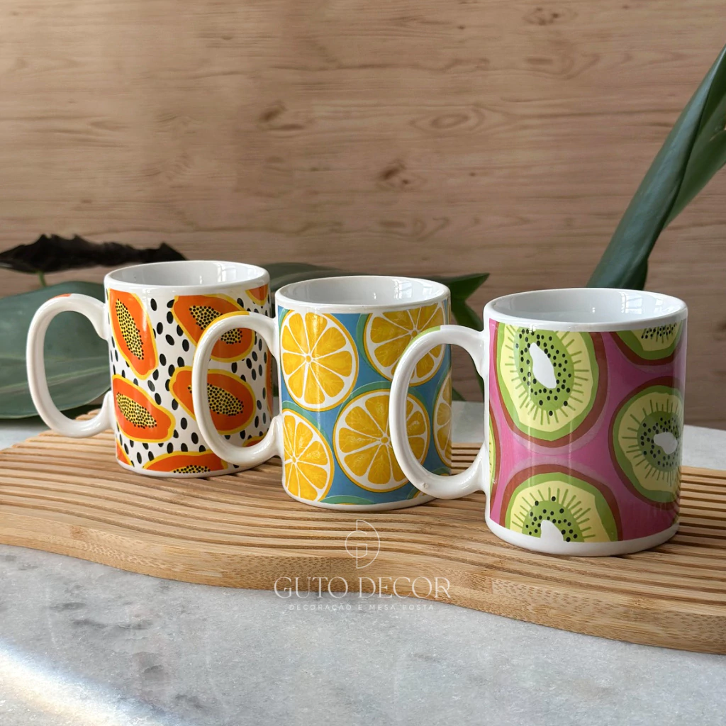 Especificações - Material: Cerâmica - Estampas: Limão, Kiwi, Mamão - Acabamento colorido e resistente