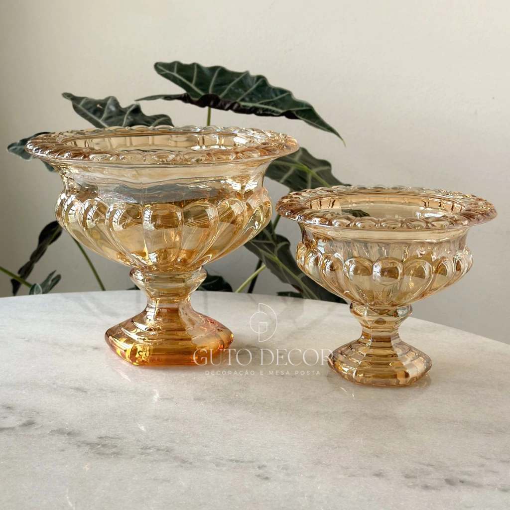 O Centro de Mesa Fruteira Romana Âmbar, disponível nos tamanhos G e P, é uma peça sofisticada que evoca a clássica elegância das taças romanas. Seu design com pé imponente transforma qualquer ambiente, servindo tanto para decorar quanto para exibir flores ou frutas com charme.