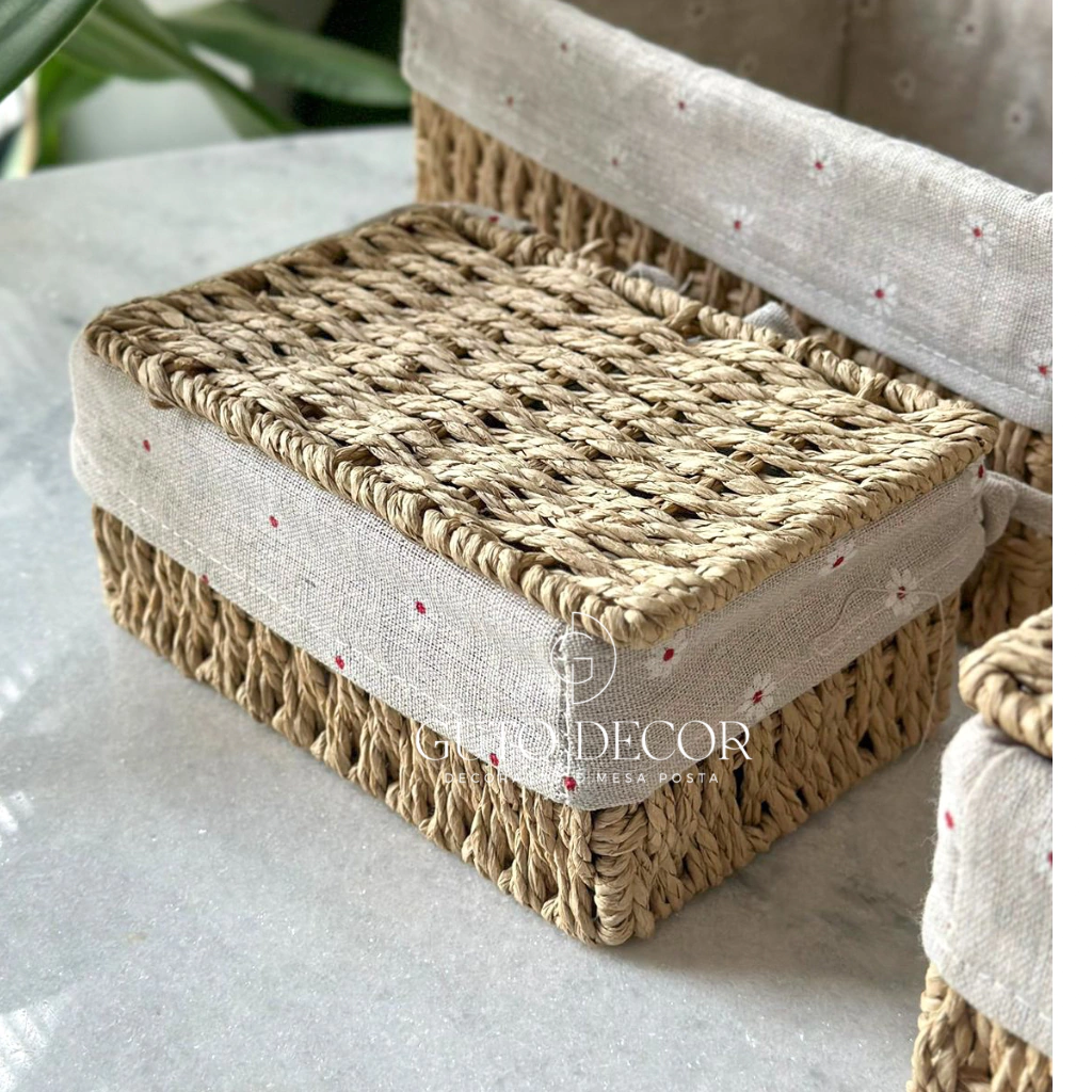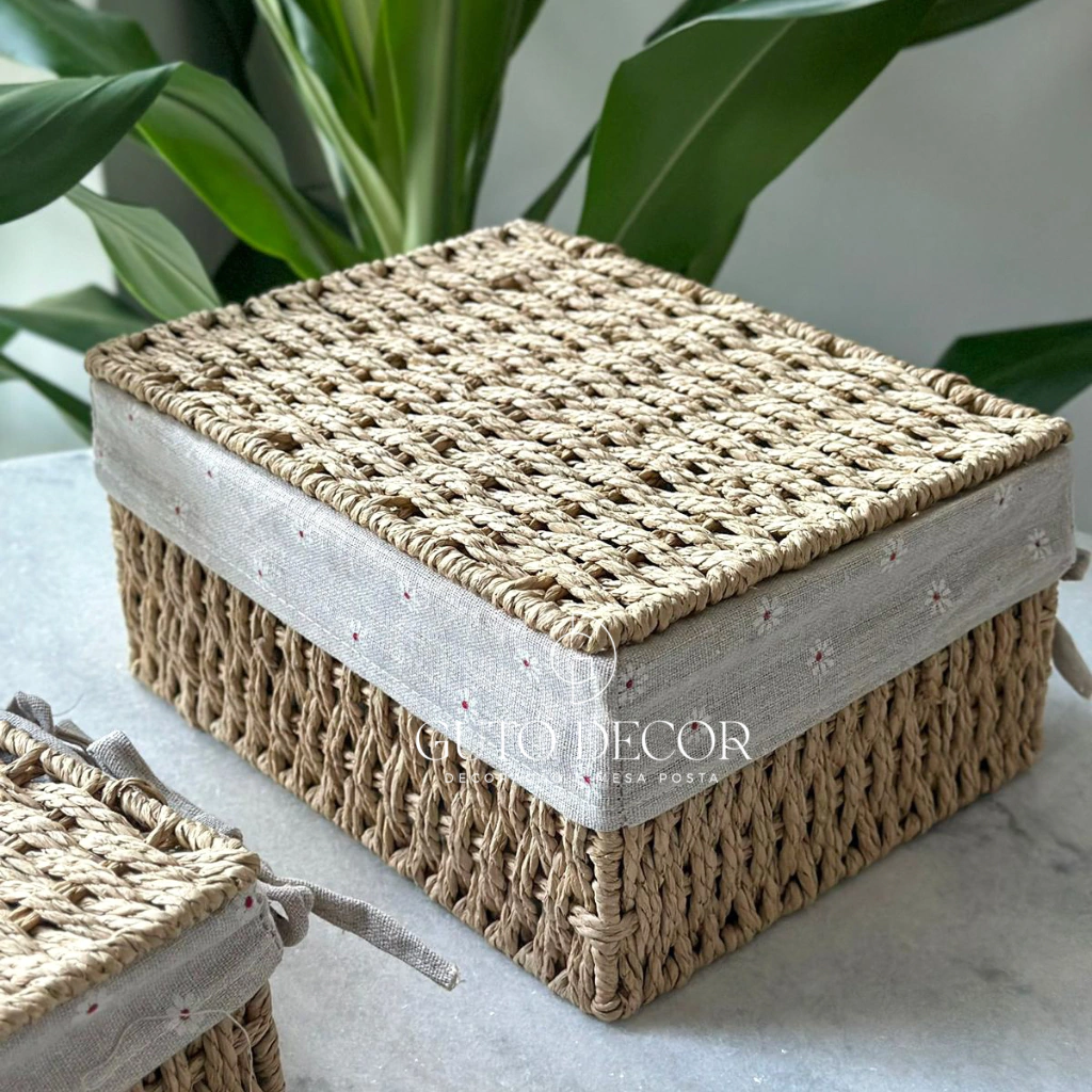 Cesto com tampa confeccionado em fibra natural, entrelaçados de forma artesanal para criar um padrão de trama elegante e resistente. A base é revestida com um tecido, que adiciona um toque de suavidade e conforto ao conjunto.