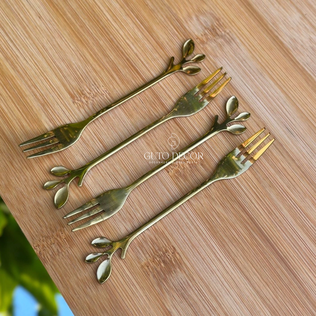 Cojunto de Garfinhos Leaves Dourado em Aço Inox 4 Peças 12cm