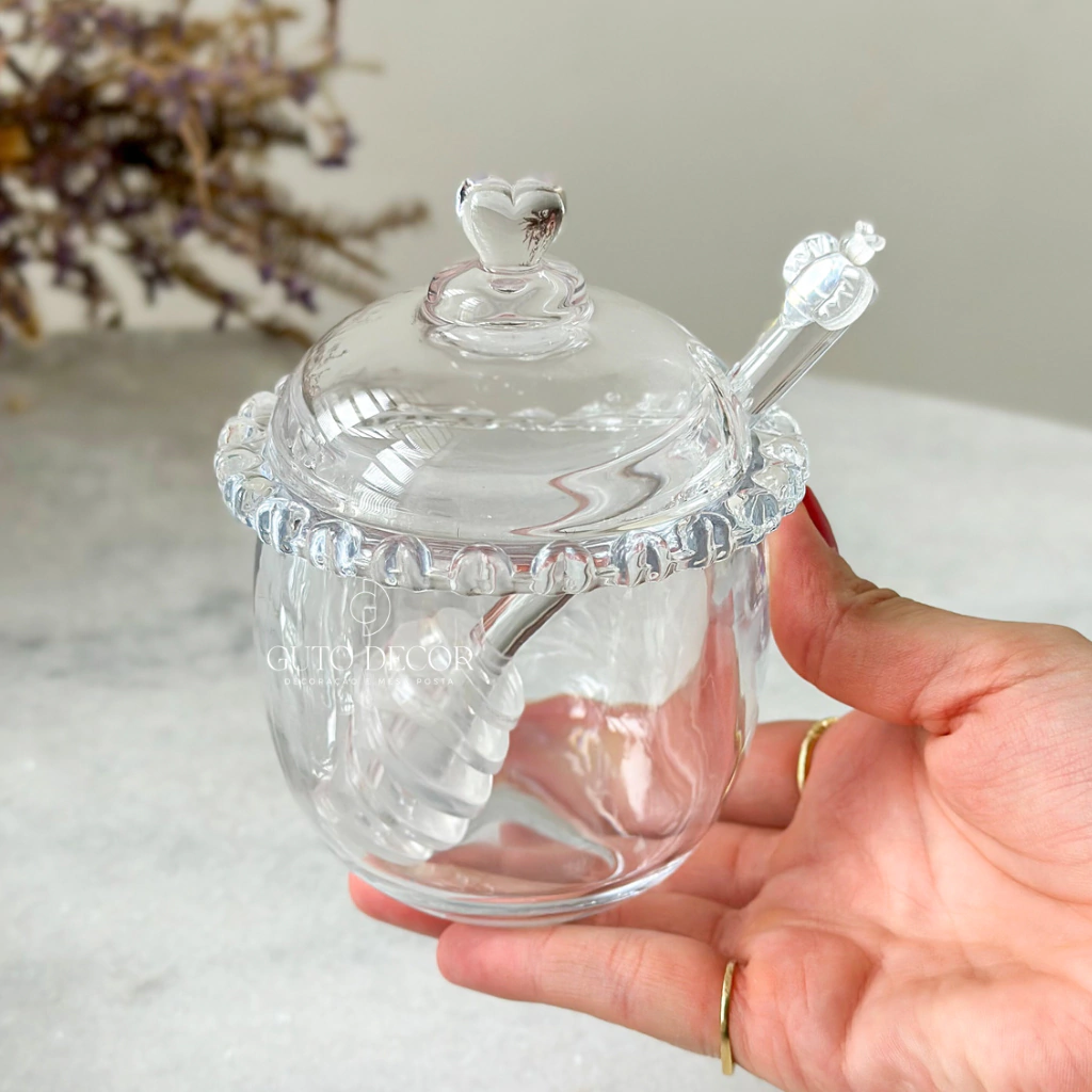 Com um design delicado, ela conta com uma tampa que possui um adorável pegador em forma de coração, ideal para manter o mel sempre fresco e saboroso.
