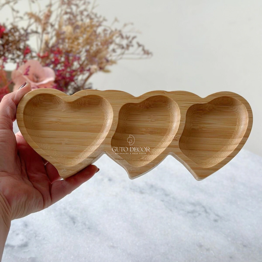 Petisqueira Tripla Coração em Bambu 25,5cm