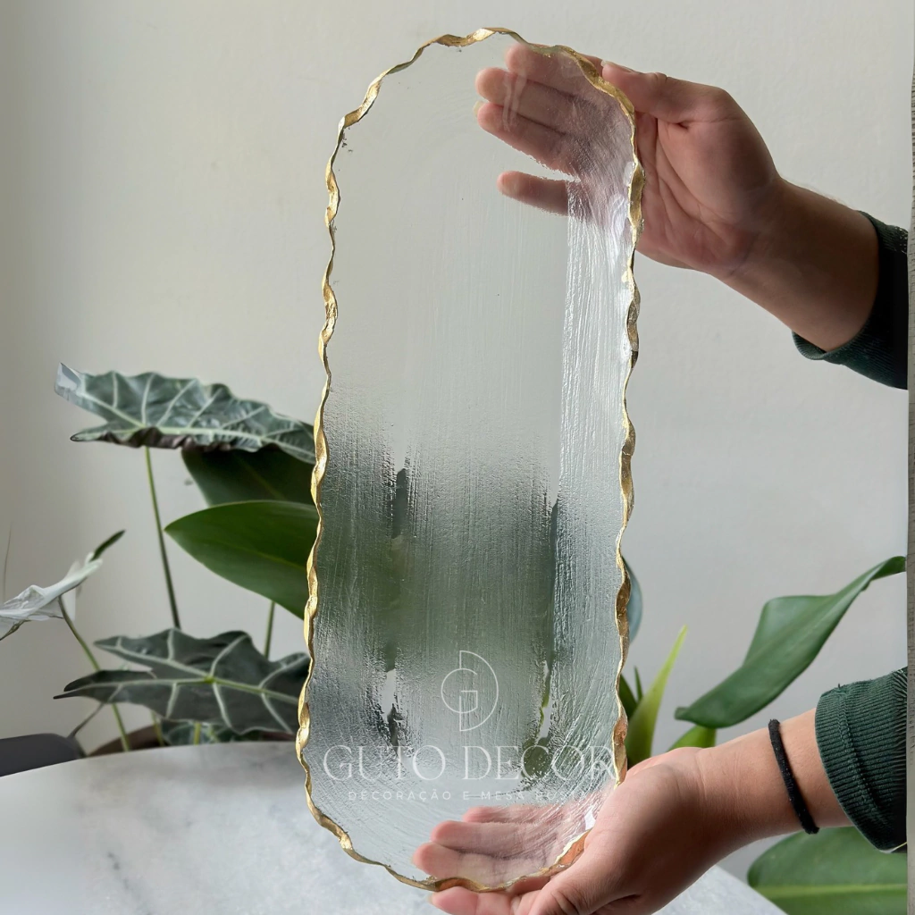 Material: Vidro martelado Acabamento: Bordas orgânicas douradas Usos: Bandeja para servir e decoração de mesa